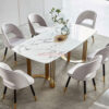 Được chế tác từ đá ceramic (đá phiến nhám hoặc bóng), bề mặt bàn có độ cứng vượt trội, chống trầy xước, kháng nhiệt và dễ vệ sinh. Bề mặt sáng bóng hoặc nhám mịn tùy chọn, mang lại sự tinh tế và hiện đại. - Khung chân inox mạ vàng sang trọng