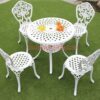Chất liệu nhôm đúc nguyên khối kết hợp lớp sơn tĩnh điện bền màu giúp bàn chống gỉ sét, chịu được nắng mưa và giữ vẻ đẹp như mới qua nhiều năm sử dụng. Mặt bàn được chạm hoa văn tinh xảo, chân bàn vững chãi, mang nét cổ điển châu Âu đầy cuốn hút.