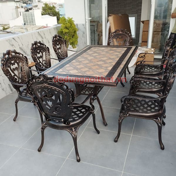 Khung bàn được làm từ nhôm đúc sơn tĩnh điện, đảm bảo độ bền cao và khả năng chống gỉ sét trong mọi điều kiện thời tiết. Mặt bàn bằng đá vừa tạo điểm nhấn thẩm mỹ, vừa dễ dàng vệ sinh, duy trì vẻ đẹp lâu dài.