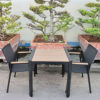 Mặt bàn sử dụng nan Polywood giả gỗ, vừa mang lại vẻ đẹp tự nhiên, vừa chống cong vênh và dễ vệ sinh. Sản phẩm có hai màu sắc lựa chọn là đen và xám, phù hợp với nhiều phong cách không gian sân vườn, ban công hoặc quán cà phê ngoài trời.
