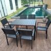 Sản phẩm sử dụng khung nhôm đúc sơn tĩnh điện màu đen sang trọng, bền bỉ trước tác động của thời tiết. Mặt bàn làm từ nan Polywood giả gỗ với các thanh nhựa ngang như hình, vừa mang lại vẻ đẹp tự nhiên vừa dễ dàng vệ sinh. Thiết kế vuông vắn, chắc chắn, phù hợp sử dụng cho sân vườn, ban công, quán cà phê hoặc nhà hàng ngoài trời.