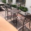 Chất liệu nhôm đúc nguyên khối phủ sơn tĩnh điện giúp bàn chống gỉ sét, chống phai màu và bền đẹp bất chấp thời tiết nắng mưa. Mặt bàn chạm hoa văn tỉ mỉ, kết hợp với chân bàn chắc chắn, tạo nên phong cách cổ điển châu Âu sang trọng.