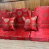 Bộ đệm ghế gỗ gây ấn tượng mạnh với gam màu đỏ tươi nổi bật, kết hợp họa tiết tròn cổ điển ánh kim được dệt tinh xảo trên nền vải gấm cao cấp. Thiết kế này mang đậm phong cách truyền thống, phù hợp với không gian phòng khách gia đình, biệt thự gỗ hoặc những không gian tiếp khách mang hơi hướng Á Đông.